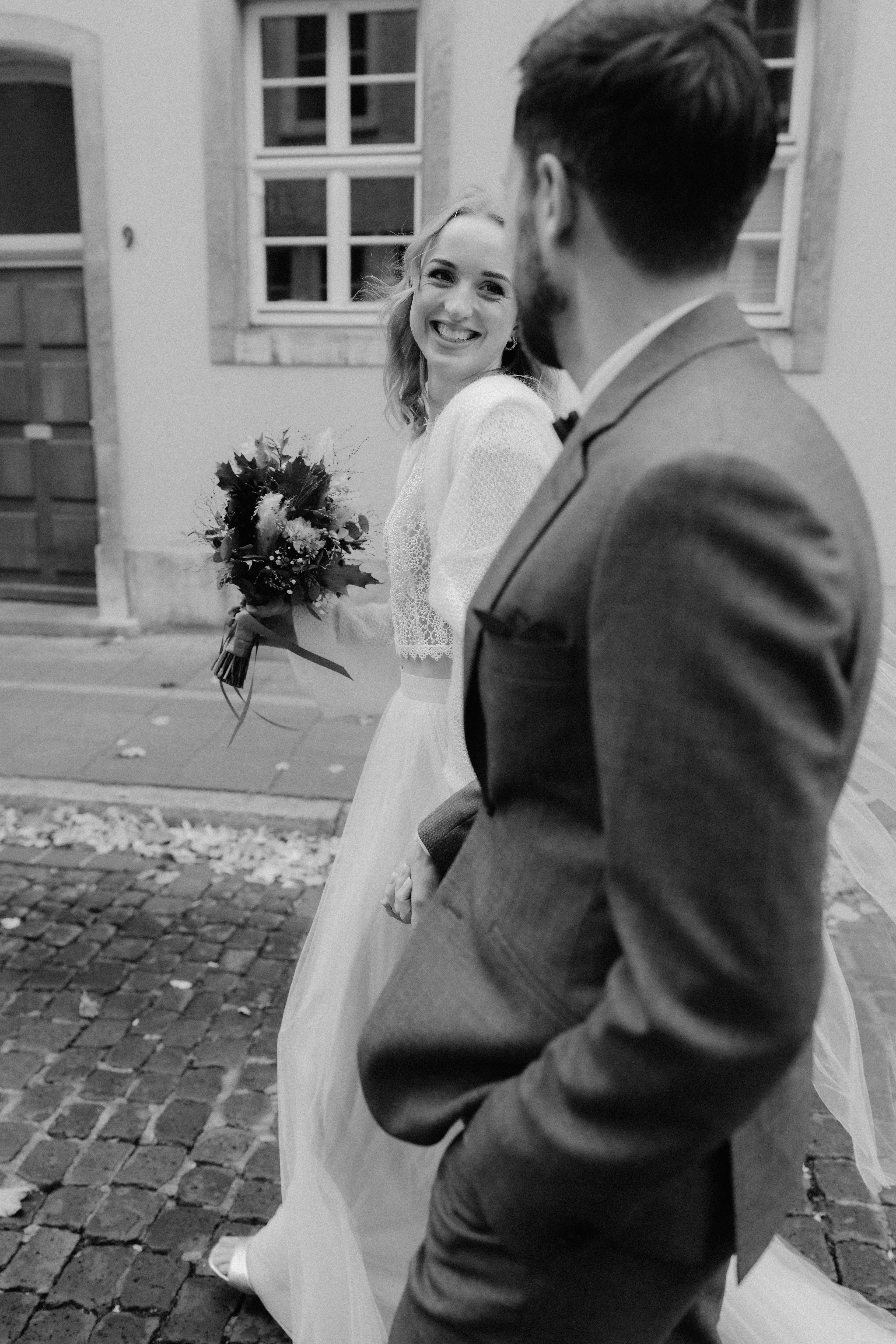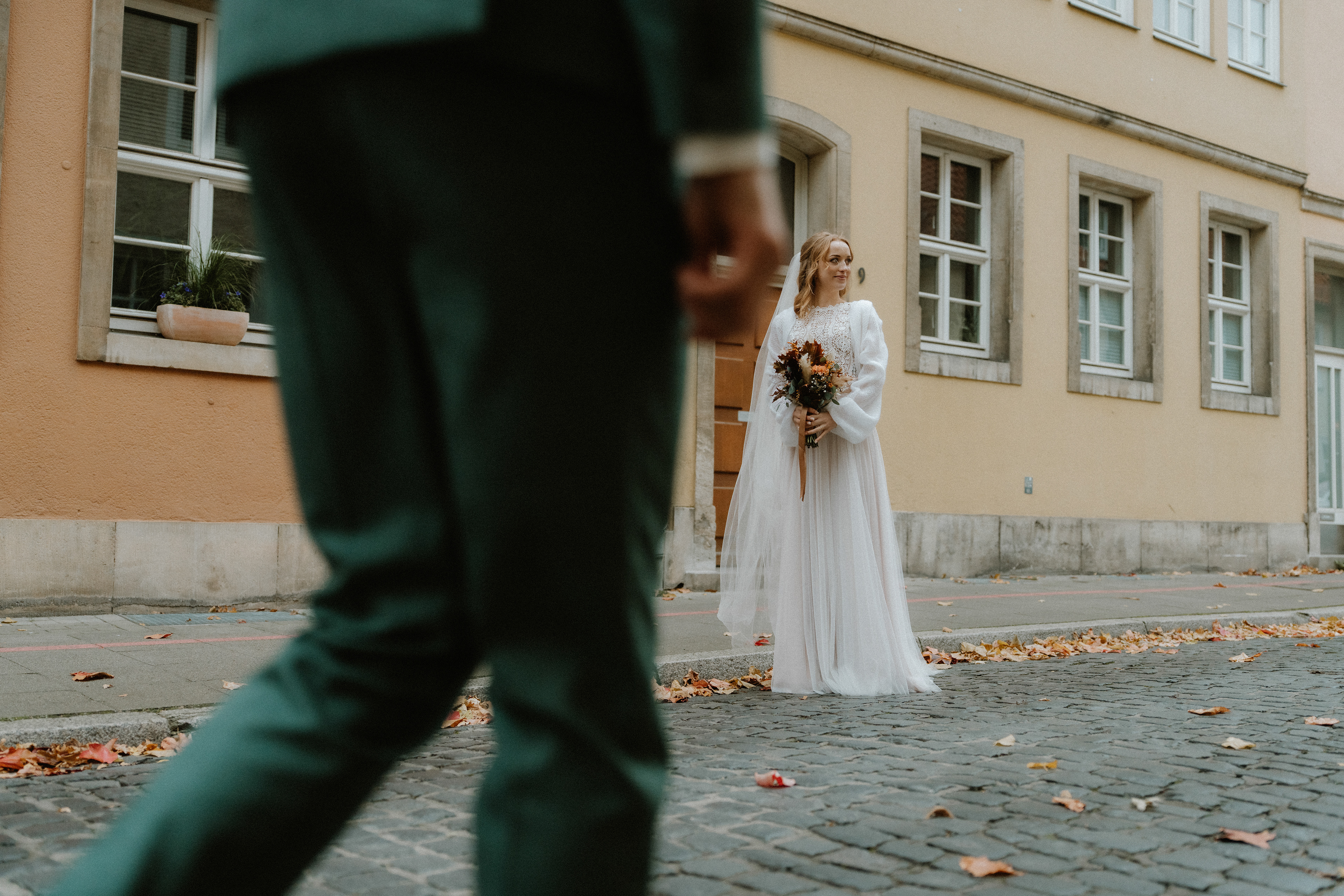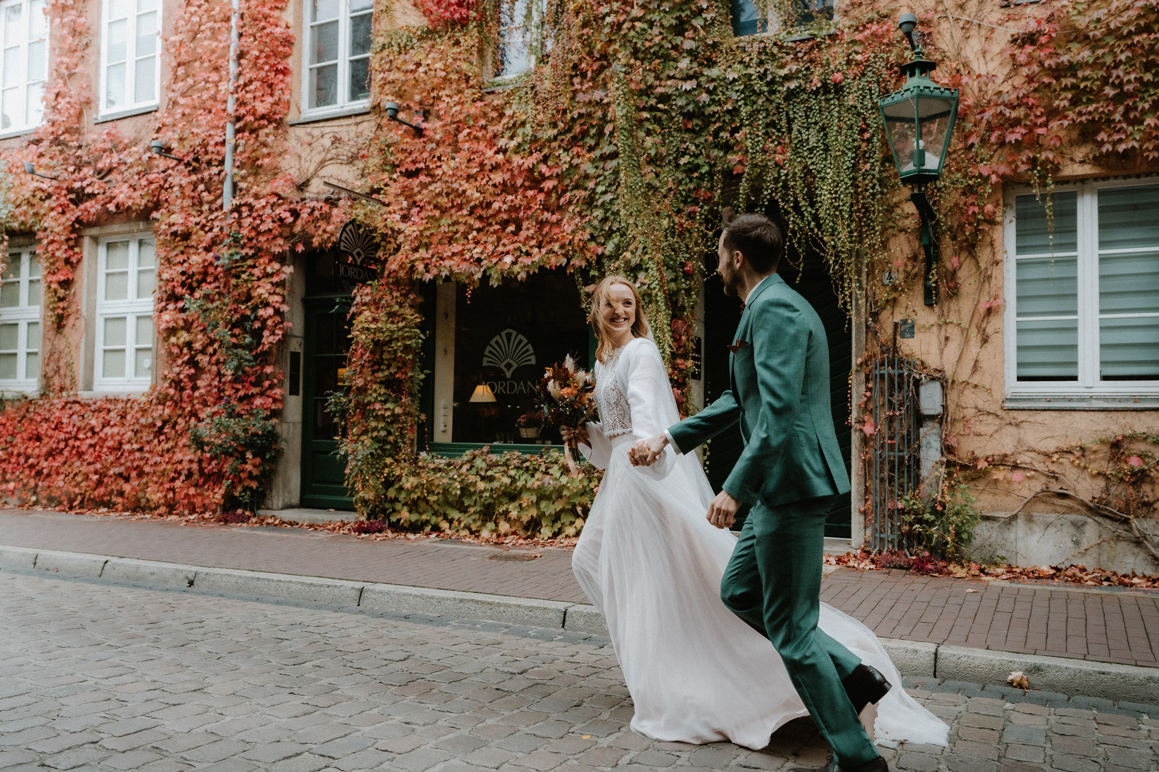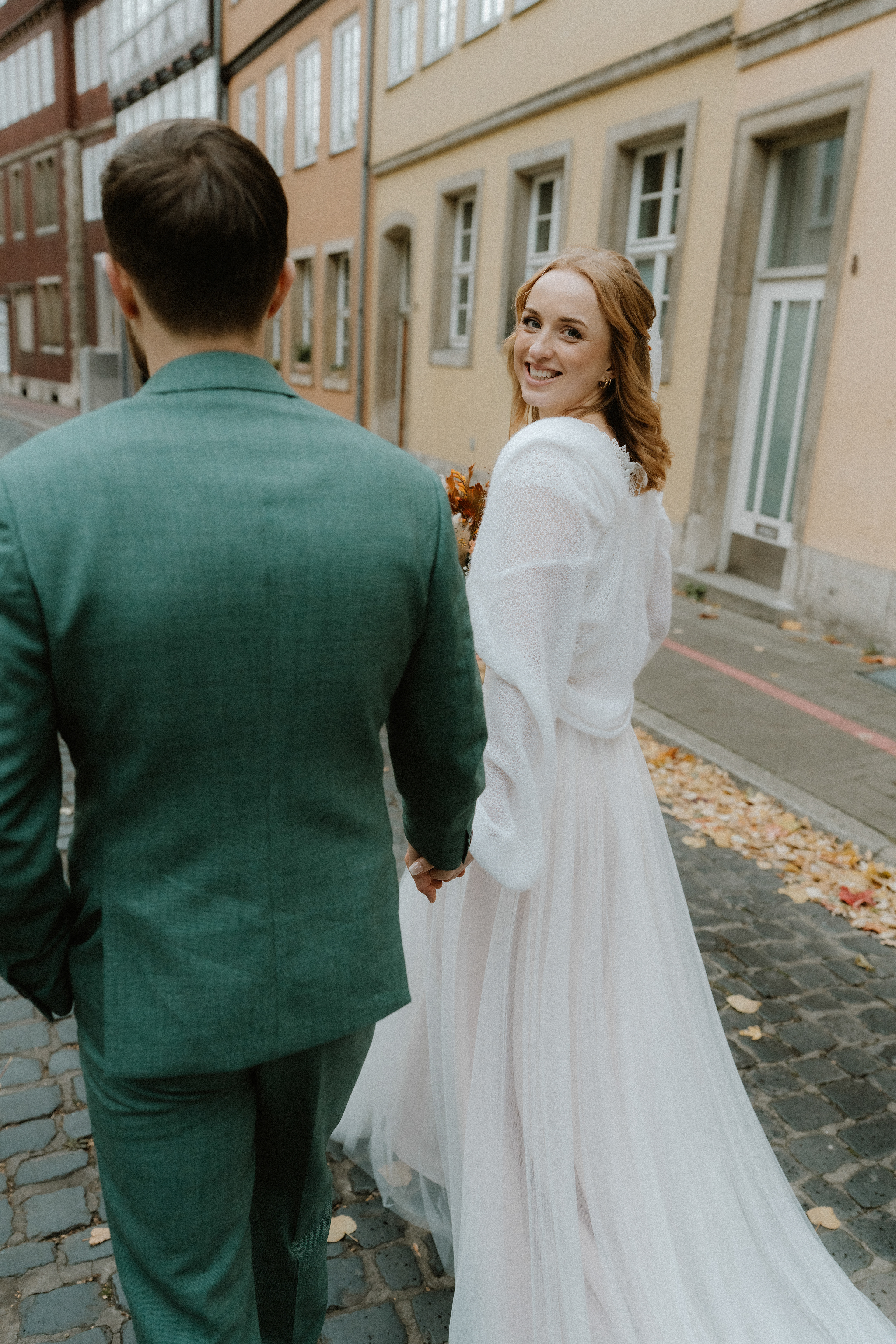 Für das anschließende Paarshooting ging es in die Altstadt Hannover. Die historischen Straßen und Gassen sind perfekt für zeitlose Hochzeitsfotos. Da es bereits Oktober war, waren nur wenige Passanten unterwegs, sodass wir die ruhige, herbstliche Atmosphäre für natürliche und ungestellte Aufnahmen nutzen konnten.
